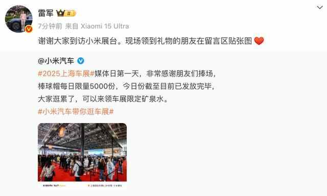 今年4月,雷军发文称:“到访小米展位的朋友,可以免费领取车展限定矿泉水,还有Ultra棒球帽(每天送5000个)。”