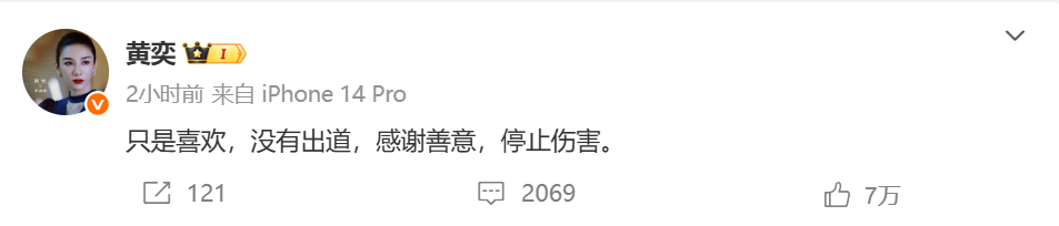 8月4日晚,黄奕微博发文辟谣女儿出道传闻:只是喜欢,没有出道,感谢善意,停止伤害。