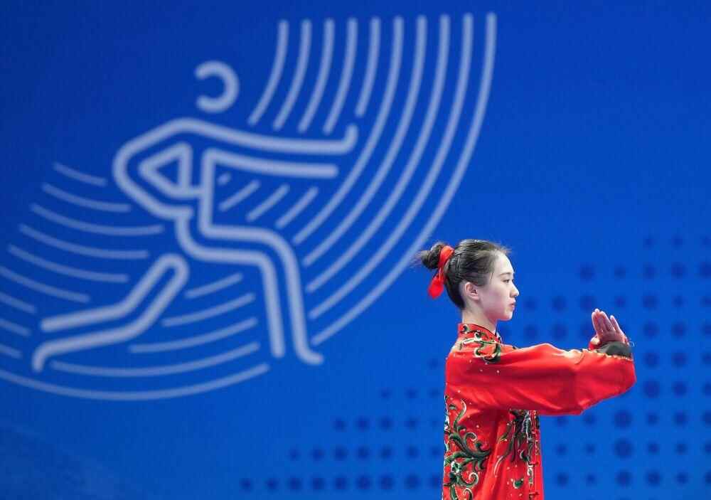↑2023年9月24日,中国选手童心在杭州亚运会武术项目女子太极拳太极剑全能决赛中夺得冠军。