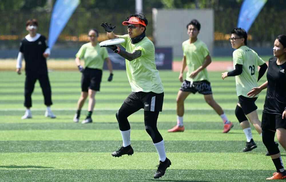 ↑2022年8月6日,超光速俱乐部西安分部队队员陈世圣(左三)在2022-2023年中国飞盘联赛(陕西·西安站)中。
