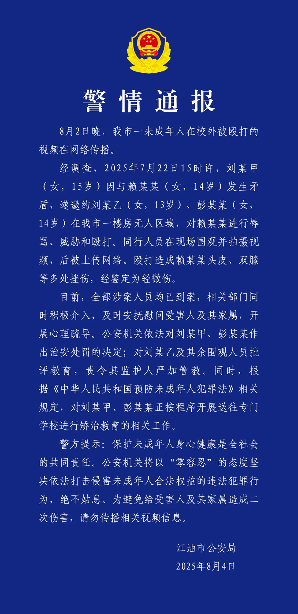 8月4日,四川江油市公安局发布通报:8月2日晚,我市一未成年人在校外被殴打的视频在网络传播。目前,全部涉案人员均已到案,相关部门同时积极介入,及时安抚慰问受害人及其家属,开展心理疏导。公安机关依法对刘某甲、彭某某作出治安处罚的决定;对刘某乙及其余围观人员批评教育,责令其监护人严加管教。
