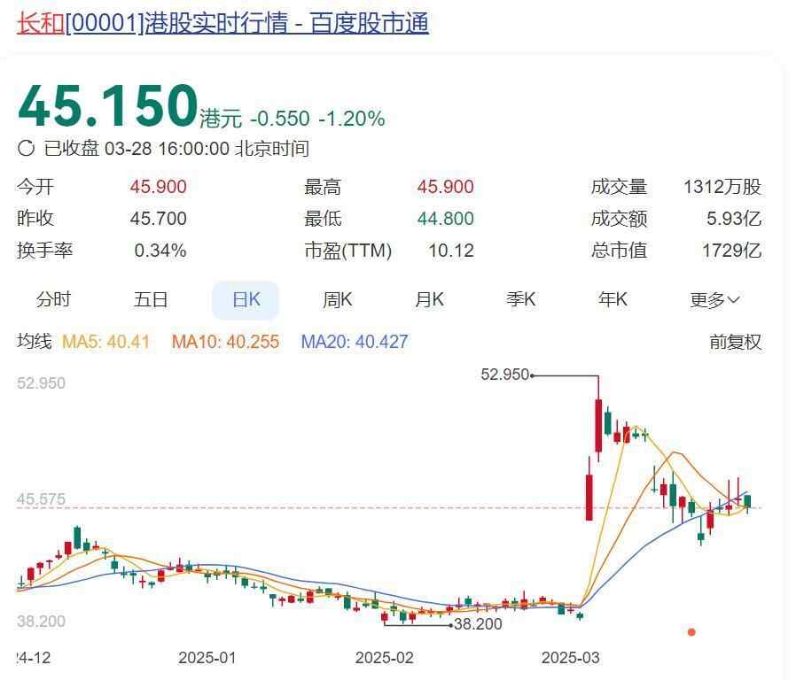 截至3月28日收盘,长和股价报收45.15港元,总市值1729亿港元。