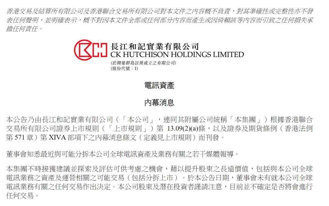 3月31日,李嘉诚旗下长江和记实业有限公司在港交所发布公告表示,董事会知悉最近与可能分拆本公司全球电讯资产及业务有关之若干媒体报道,于本公告日期(3月31日),董事会未有就本公司全球电讯业务有关之任何交易作出决定,目前并不确定是否将会进行任何交易。