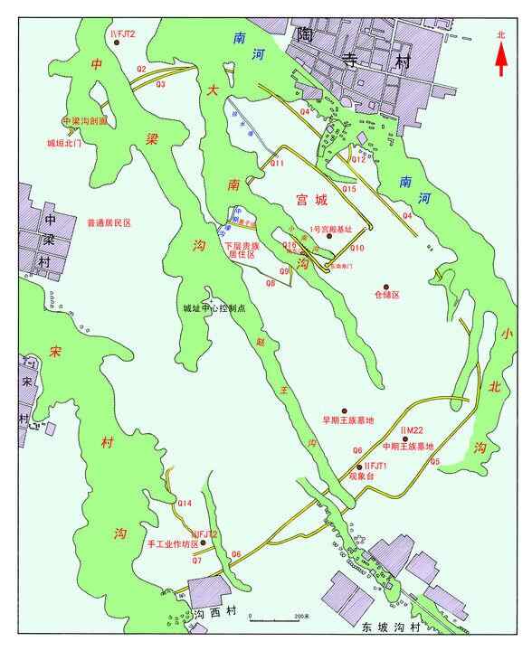这座大城清晰呈现出“宫城—郭城”的分野,城址分为内、外两城,功能分区、等级秩序和空间格局分明有序:从1978年首次发掘至今,陶寺遗址陆续发掘出城墙、宫殿区、宫室类夯土建筑、大型墓地、统一管理的手工业作坊区、大型仓储区和平民区等,功能十分完备。