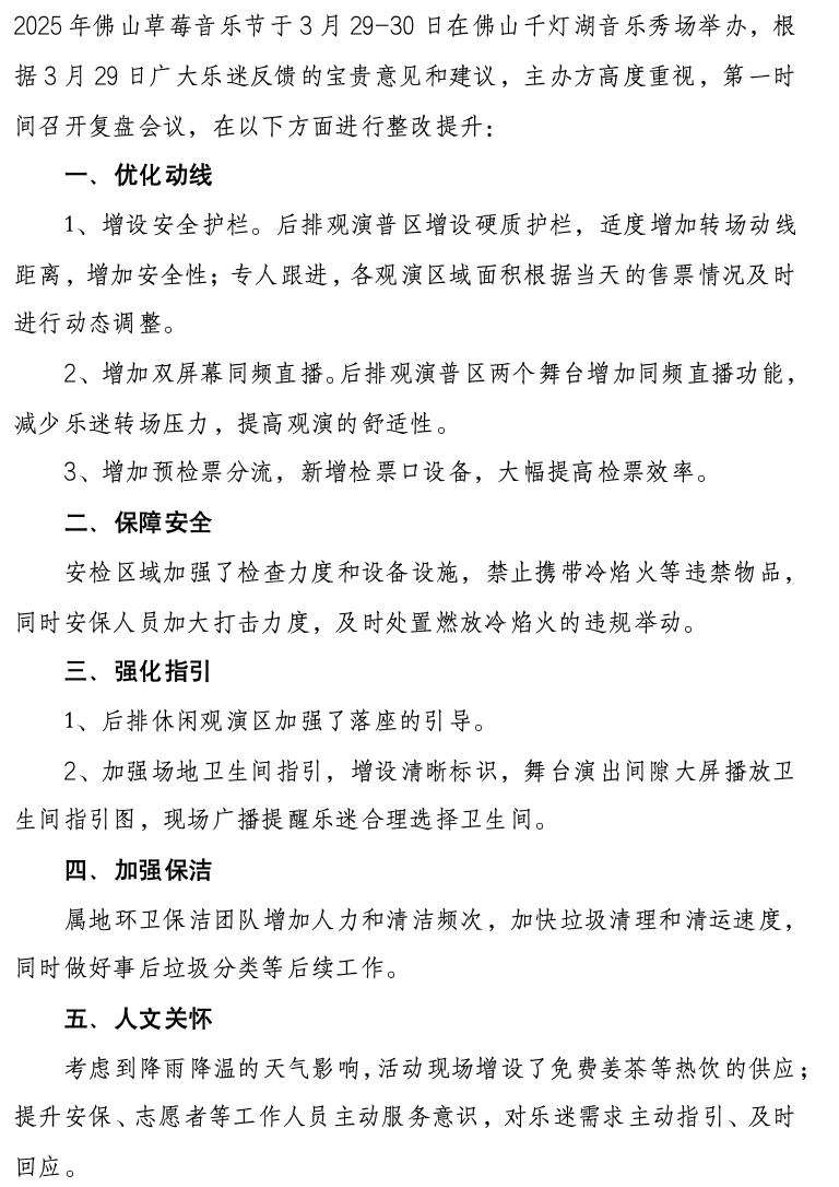 记者留意到,文件中提到音乐节在优化动线、保障安全、强化指引、加强保洁以及人文关怀等方面作了整改。例如歌迷反映的动线设置上,主办方增设了安全护栏,同时增加双屏幕同频直播。针对有乐迷燃放冷焰火等违禁物品,主办方表示将加大安保力度,对违规举动及时处置。