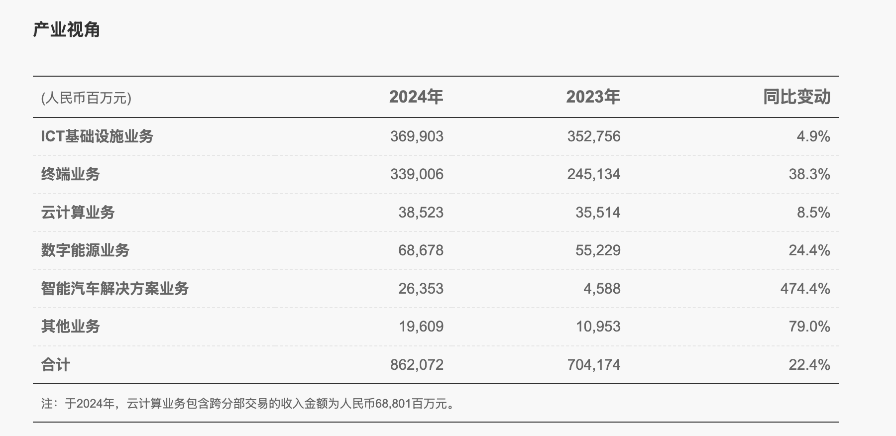 具体来看,2024年,华为ICT基础设施业务实现营收3699.03亿元,同比增长4.9%;终端业务营收3390亿元,增长38.3%;云计算业务营收385.23亿元,增长8.5%;数字能源业务营收686.78亿元,增长24.4%;智能汽车解决方案业务营收263.53亿元,大幅增长474.4%;其他业务营收196.09亿元,增长79%。华为总营收同比2023年增长22.4%,整体业绩呈现稳健增长态势。截至2024年12月31日,研发员工约11.3万名,占总员工数量的54.1%,华为在全球共持有有效授权专利超过15万件。