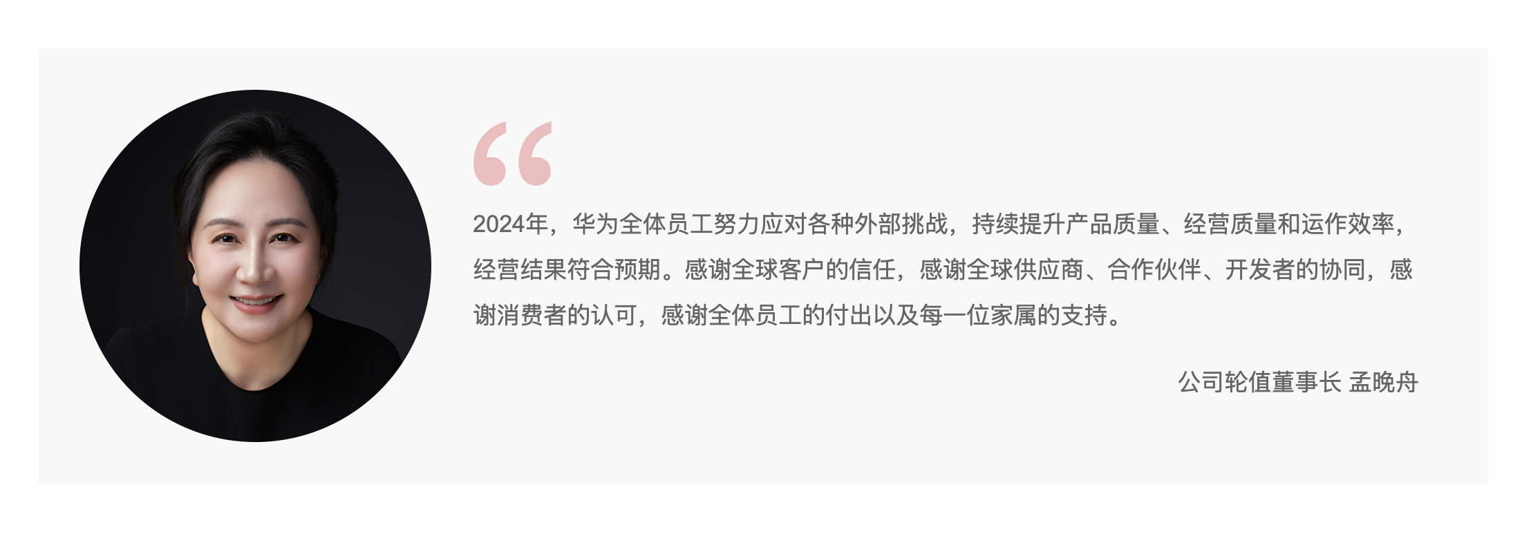 当天,华为副董事长、轮值董事长、CFO孟晚舟强调:“2024年,华为全体员工努力应对各种外部挑战,持续提升产品质量、经营质量和运作效率,经营结果符合预期。感谢全球客户的信任,感谢全球供应商、合作伙伴、开发者的协同,感谢消费者的认可,感谢全体员工的付出以及每一位家属的支持。2025年,华为将进一步把‘以质取胜’落实到各项管理制度和业务活动中,坚持质量目标牵引,不断提升质量竞争力。”同时,华为将持续做强根生态,秉持“开放、协作、利他”的理念,围绕鸿蒙、鲲鹏、昇腾、云计算等业务,面向生态伙伴开放平台能力,向开发者持续提供好用易用的工具和产品,加速生态繁荣,共促产业活力。