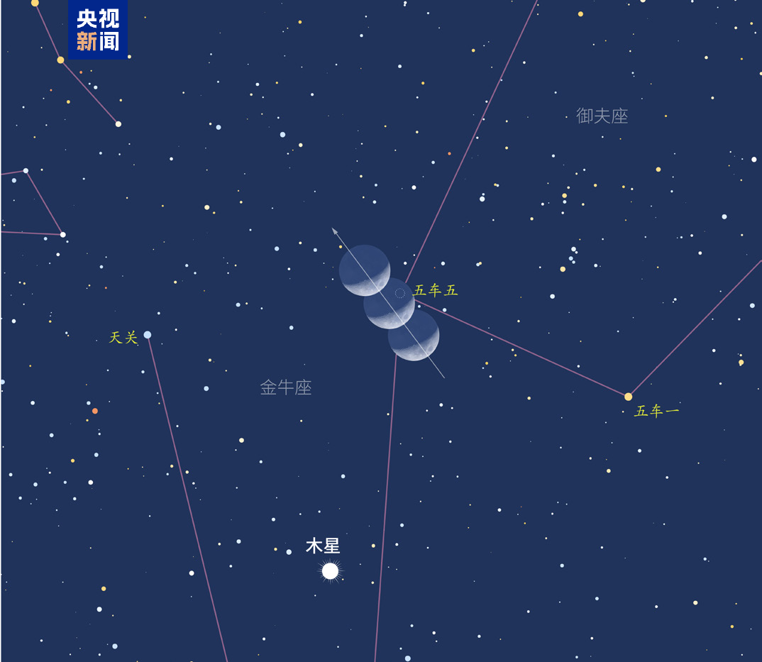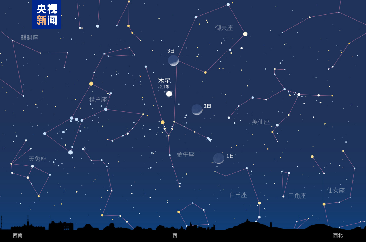 4月初,月亮在金牛座“漫步”,1日至3日依次经过昴星团和木星,这几天傍晚,我们能看到空中昴星团、木星伴月的景象。