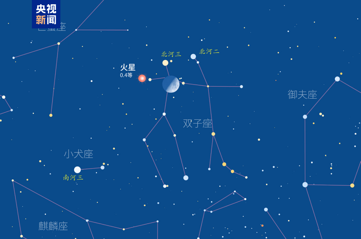 到了4月5日前半夜,月亮会来到双子座的头部,人们还可以欣赏天空中的火星和北河三伴月。其中,北河三就是双子座的“双子”之一,是一颗橙色巨星,也是双子座最亮的星。