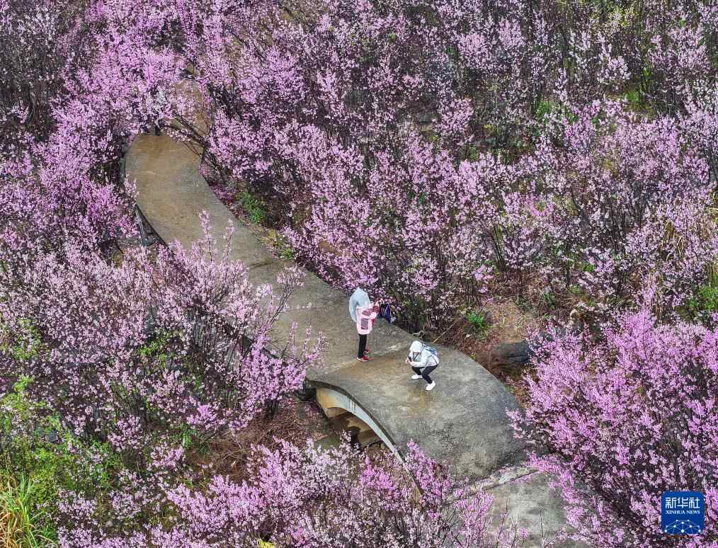 3月29日,游人在湖南省永州市江永县松柏瑶族乡紫荆花中游玩(无人机照片)。