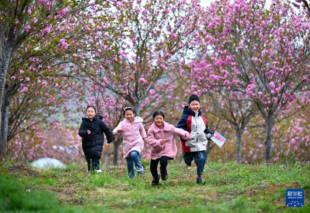 3月29日,小朋友在山东省枣庄市市中区孟庄镇桃花园里玩耍。