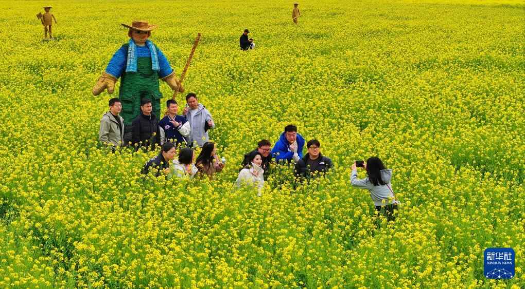 3月29日,在安徽省合肥市蜀山区小庙镇,游客在油菜花田里踏春游览(无人机照片)。