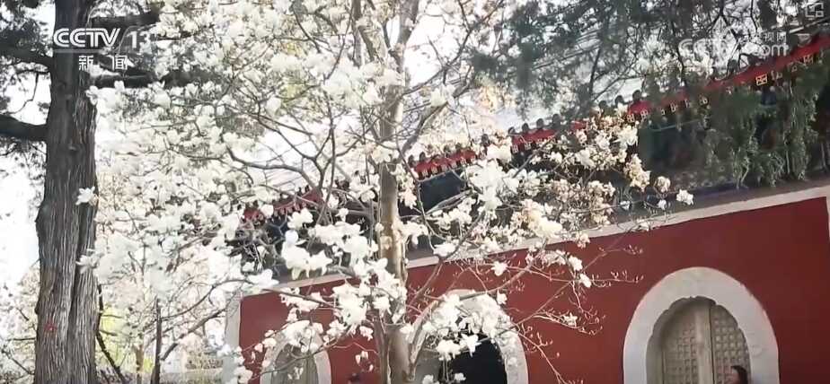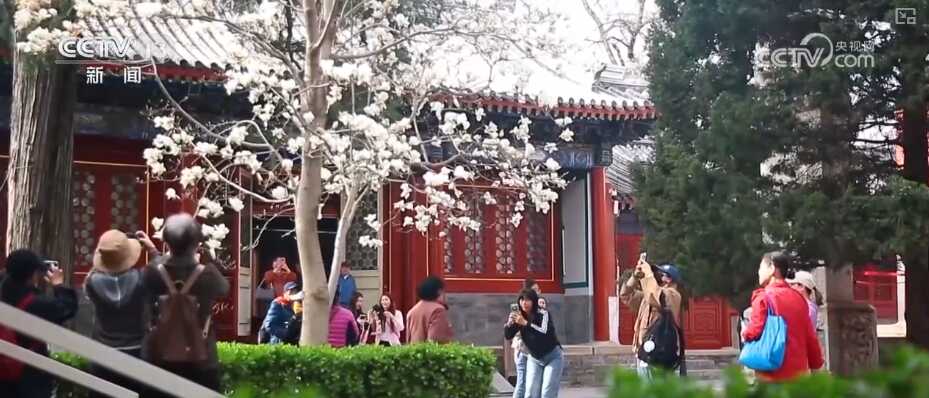近日,北京万寿寺内的玉兰花迎来了盛花期,素净的玉兰花在红墙古建的映衬下韵味十足,赏花拍照的游客络绎不绝,以院内玉兰为原型的文创产品销售火爆。