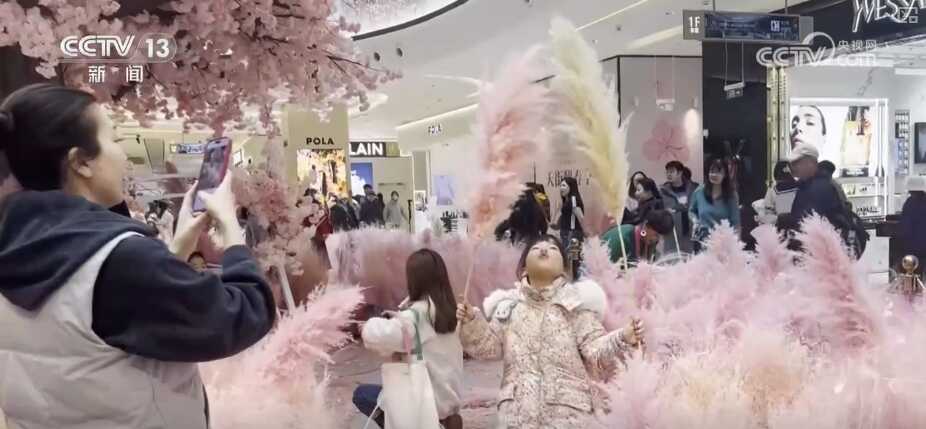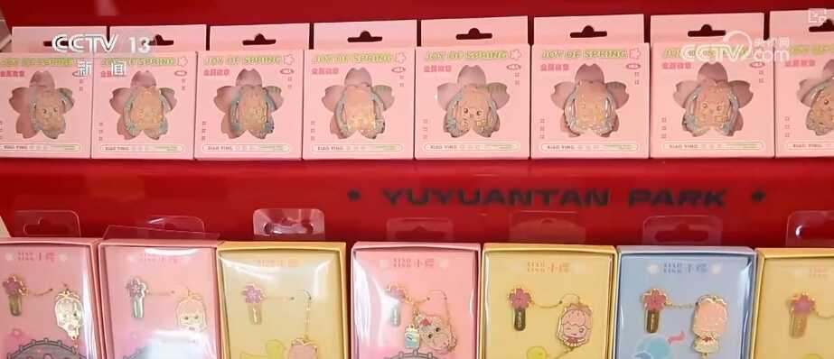 2025年3月,玉渊潭公园文创产品还走出了公园、走进了商圈。在朝阳区一购物中心,“粉樱花海”和8米高的巨型“樱花树”吸引了众多游客打卡拍照。冰箱贴、徽章等多种品类的文创产品在公园之外也受到了大家的青睐,春天的气息被传递到更多的地方。
