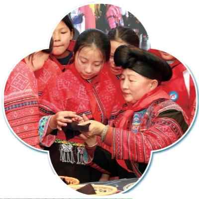 广西龙胜各族自治县龙脊镇小学,国家级非物质文化遗产代表性传承人潘继凤(右)向孩子们传授红瑶刺绣技艺。李忠波摄/光明图片
