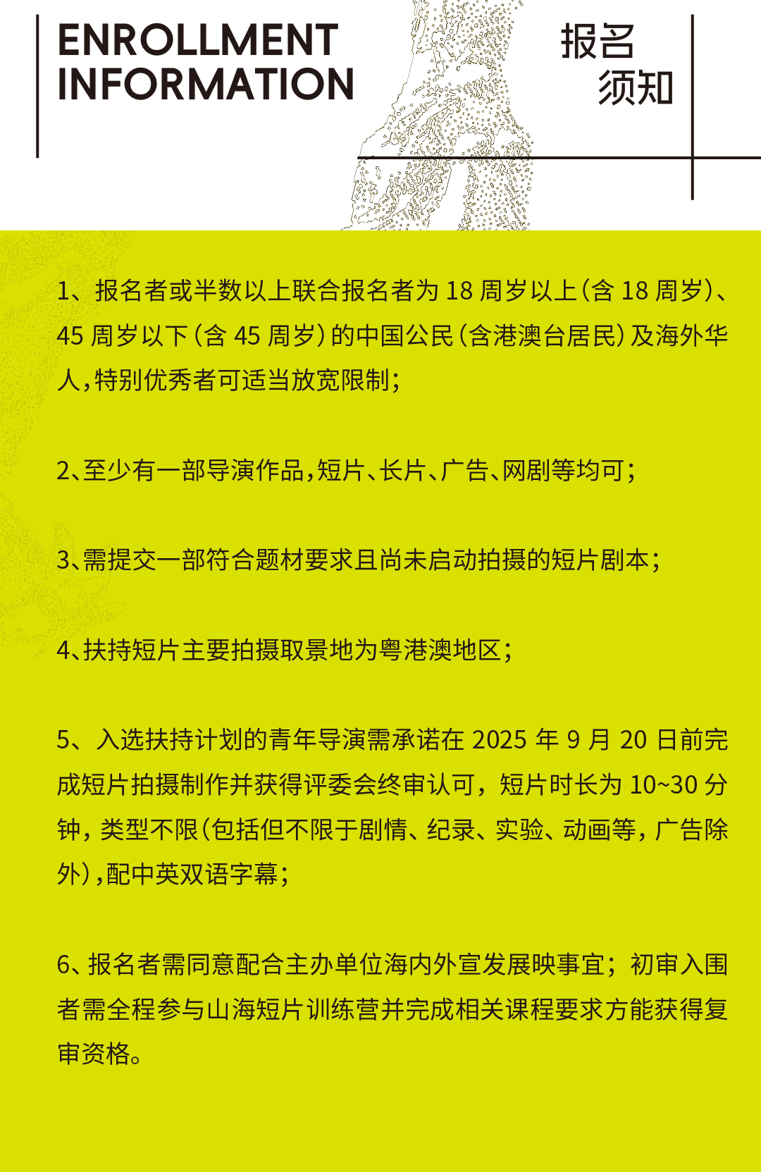山海计划将邀请业内知名导演、制片人、编剧、文化学者等担任评委和导师,以专业审慎的态度完成青年导演的选拔和训练。最终入选的10位导演将获得羊城晚报报业集团提供的7万元扶持资金和器材、场地、后期制作等资源支持,用于短片的拍摄和制作。