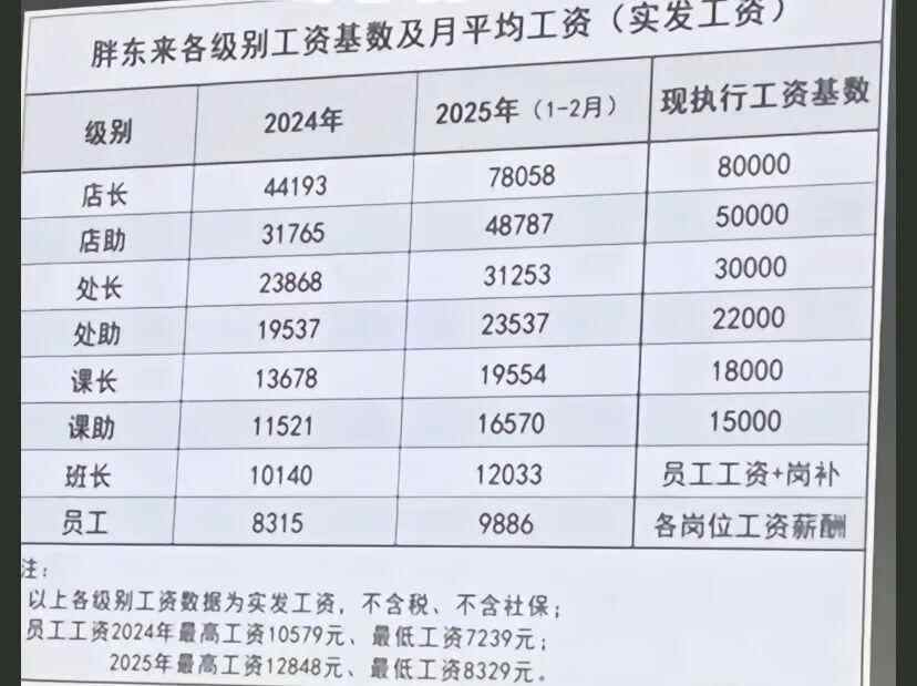 活动现场播放的PPT显示,胖东来有店长、店助、员工等八个级别,店长一级2024年月平均到手工资为44193元,2025年月平均到手工资达到了78058元。