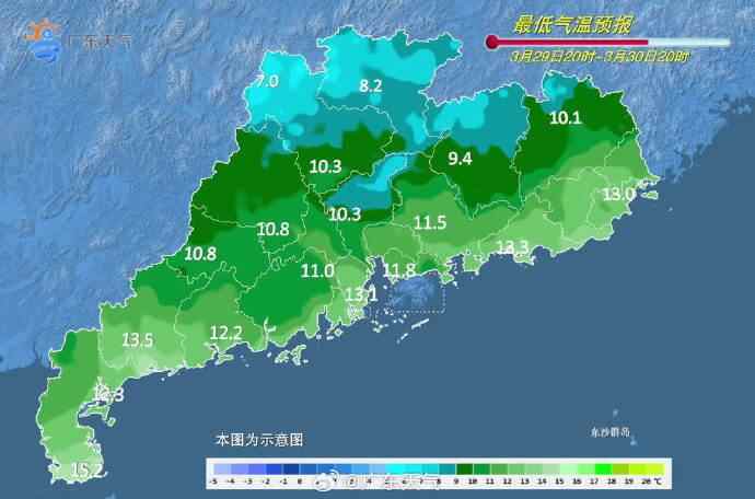 3月30日,粤北和珠三角北部市县阴天有中雨局部大雨,其余市县阴天有小雨,雨雾天气明显,昼夜温差小。最低气温:粤北市县7~10℃,粤西市县13~16℃,其余大部分市县10~13℃。
