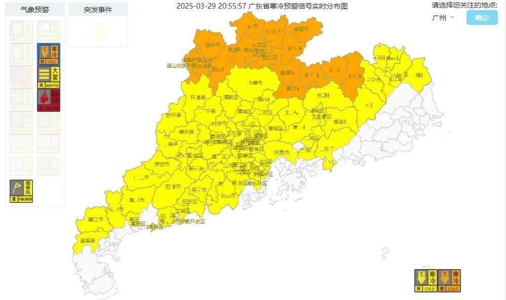 预计冷空气还将继续补充,清远北部、韶关全市、河源北部等地的县区(含县级市),自29日下午起陆续将寒冷黄色预警信号升级至寒冷橙色预警信号。