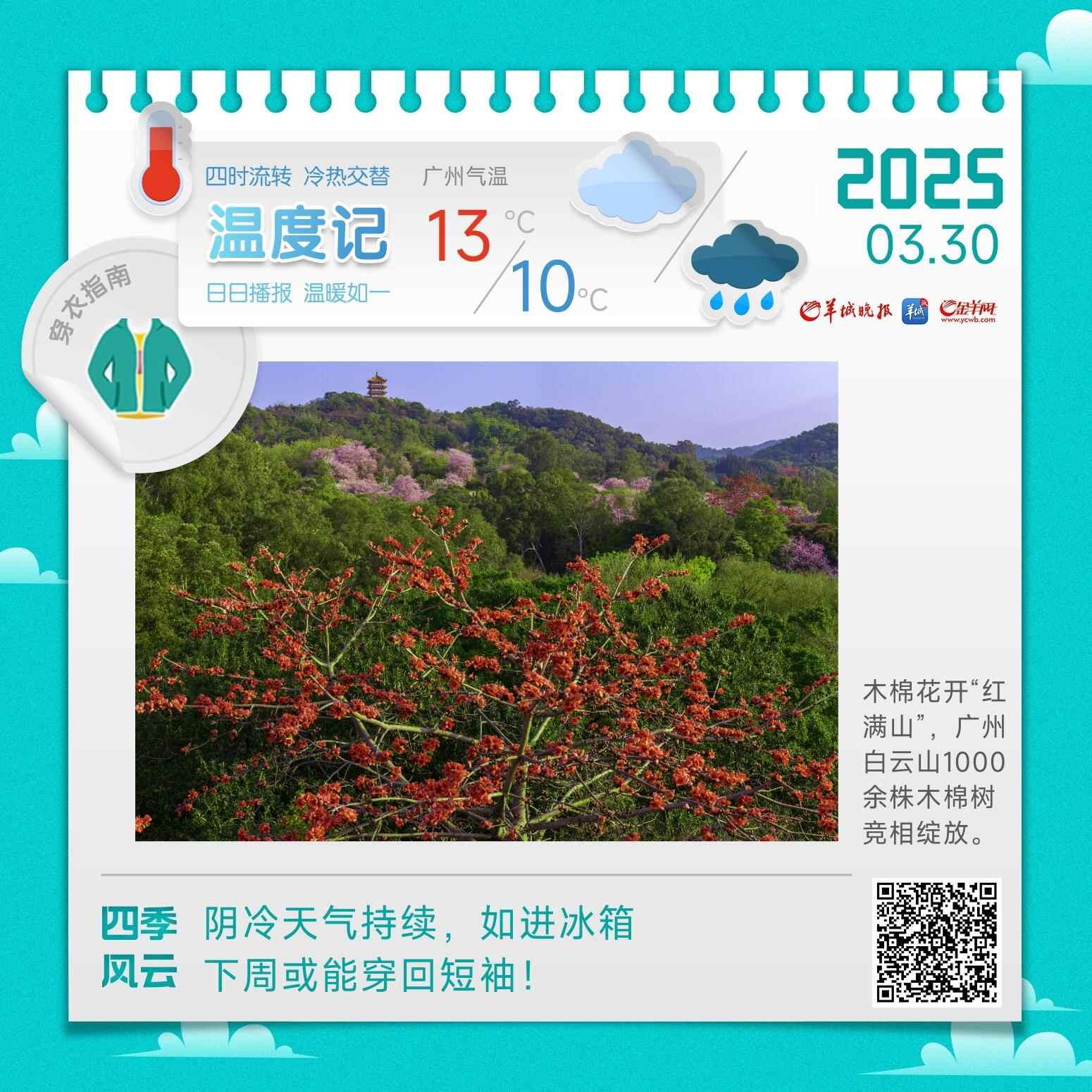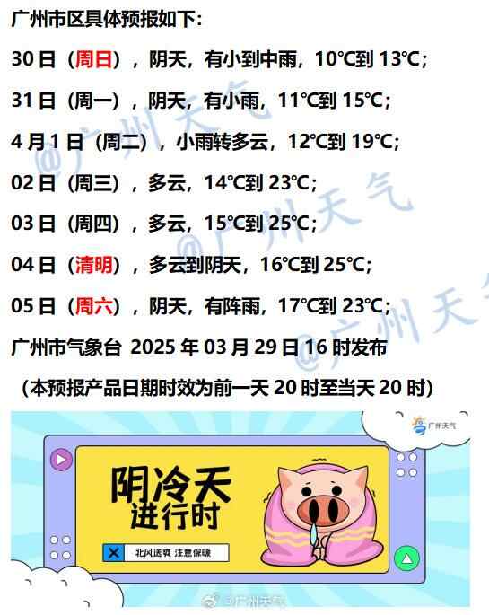 广州方面,冷空气补充,阴雨天气还会持续两天,体感较冷,气温介于10~15℃;4月1日白天起转多云天气,气温开始回升。