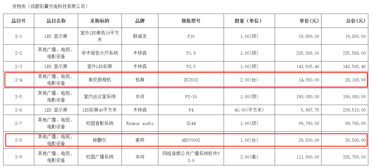 近日,在2023年的一份《四川省石棉县希望小学灾后恢复项目设备设施采购及安装中标(成交)结果公告》中,网友发现,四川省石棉县希望小学采购的“松典相机”中标价格14050元,而该相机网络售价仅631元。此外,采购清单中还包含一款“麦邦除颤仪AED7000S”,单价29500元,目前网购售价11000元。