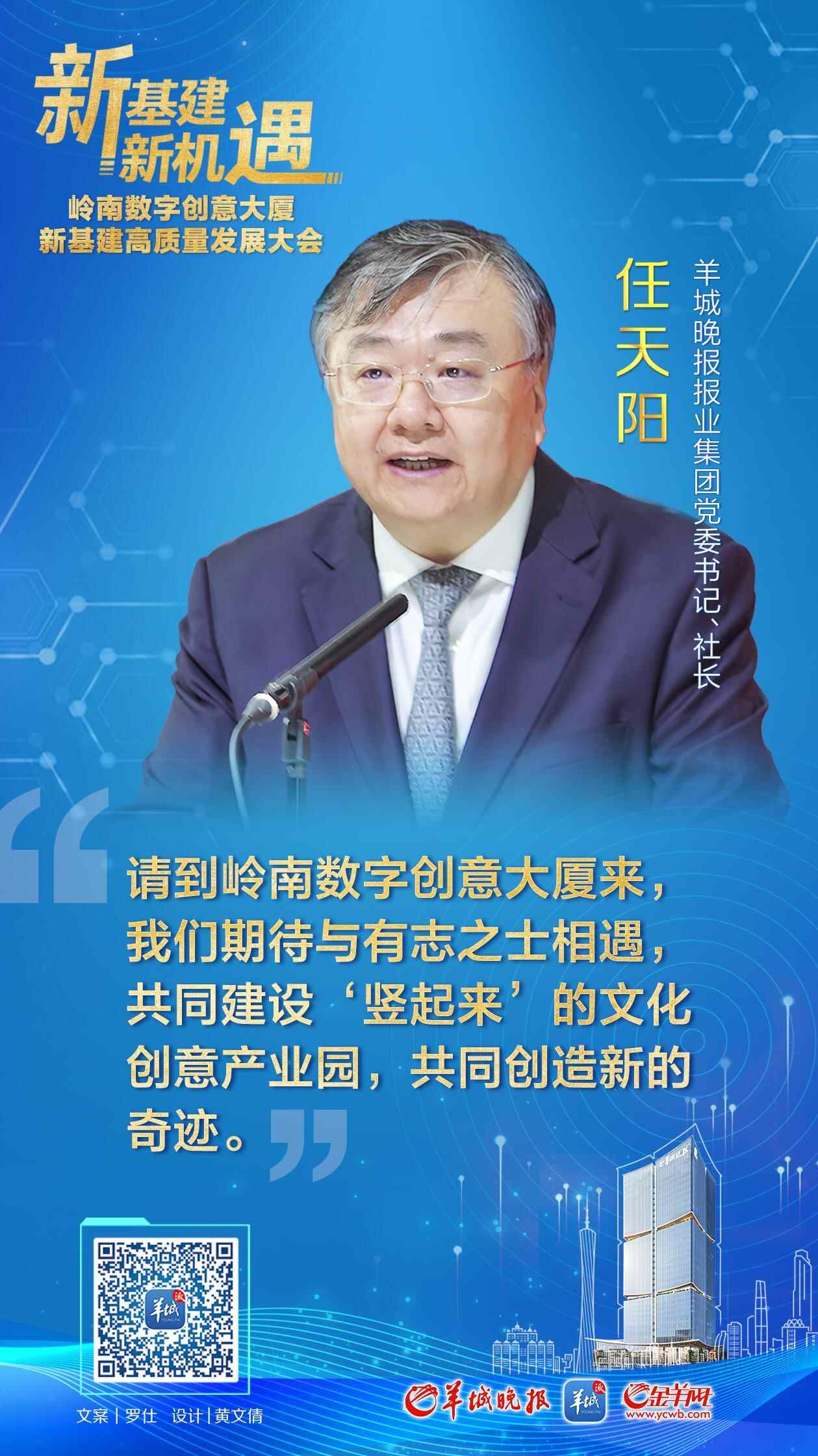 在全省上下深入学习贯彻党的二十届三中全会精神,贯彻落实全省高质量发展大会部署要求的重要时刻,3月28日,岭南数字创意大厦新基建高质量发展大会在广州羊城创意产业园举行。在大会上,羊城晚报报业集团党委书记、社长任天阳郑重向国内国际企业发出诚挚邀约:请到岭南数字创意大厦来,共同建设“竖起来”的文化创意产业园,共同创造新的奇迹。
