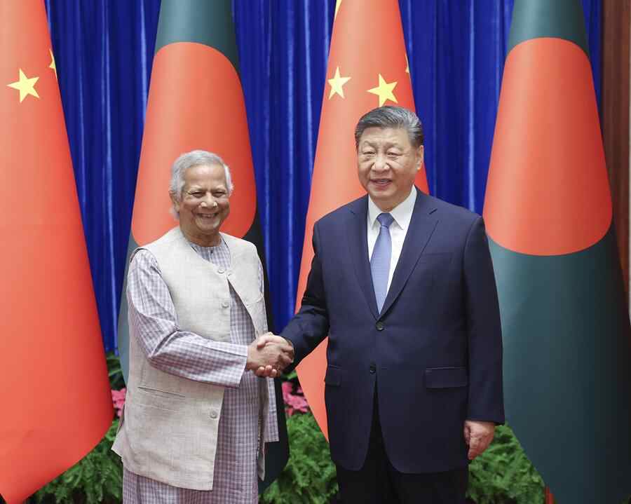 尤努斯表示,孟中友谊深厚,始终相互理解、相互尊重、相互信任,中国是孟加拉国可靠的伙伴和朋友。孟方坚定支持一个中国原则,反对“台独”。孟方愿以今年孟中建交50周年为契机,同中方共同推动两国全面战略合作伙伴关系取得更大发展。两国要深化共建“一带一路”合作,孟方欢迎更多中国企业赴孟投资,促进孟加拉国经济转型。孟方高度赞赏习近平主席提出的三大全球倡议等重大理念,愿同中方密切协调,共同把握机遇,共同应对挑战,共同维护世界和平稳定与发展繁荣。