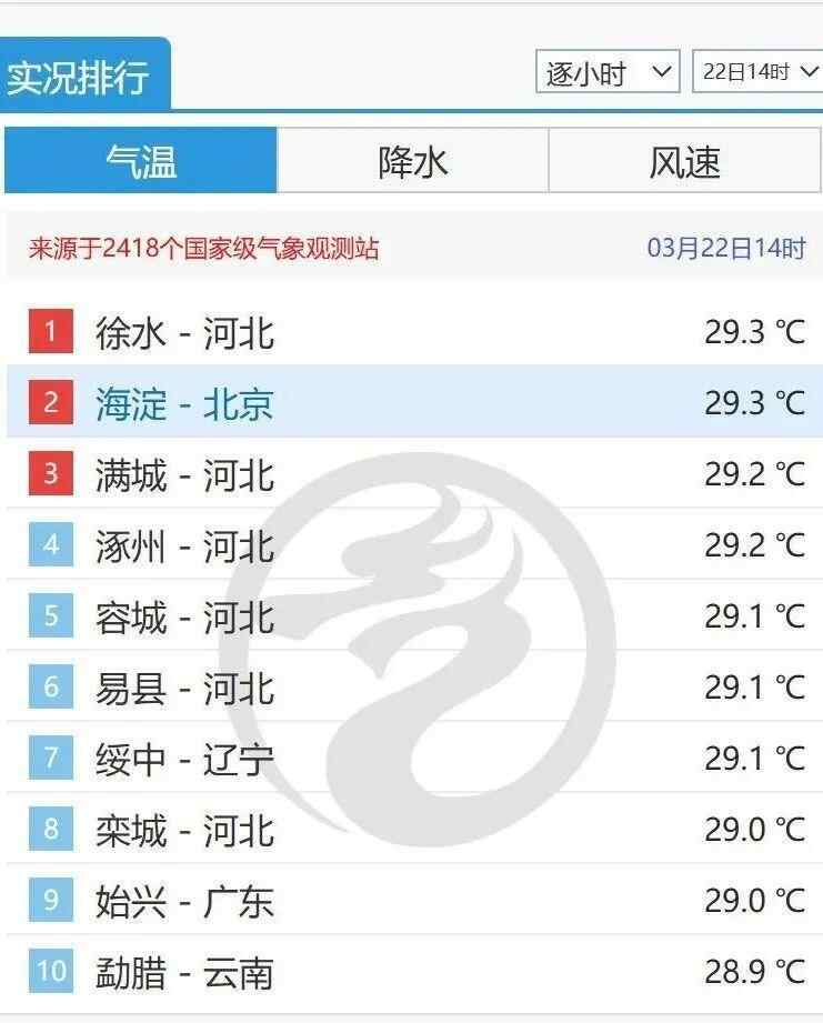 昨天(3月22日)白天,北京海淀的气温直接“卷”成了全国(并列)第一,不仅刷新了当地3月最高气温纪录,更是在之后成功冲上30℃,成为海淀自1959年有完整观测以来,首次在3月达到30℃,也成为最早的30℃日期纪录(原纪录2004-04-08)。