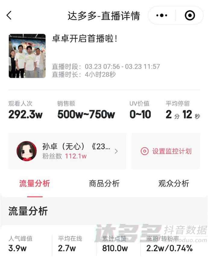 3月23日上午,电影《亲爱的》原型孙海洋儿子孙卓在个人账号开启直播带货首秀,人气一度突破3.9万,总观看人次也达到292万。达多多直播数据显示,此次直播总时长为4小时28分,销售额突破500万元。