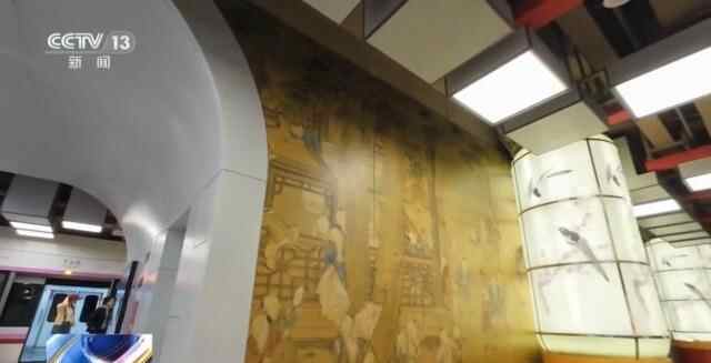 从站厅层下到站台上,还有900多个方形灯笼状灯饰。一拐弯,柱子上有喜鹊、竹子,表示喜上眉梢、竹报平安这些美好的寓意。