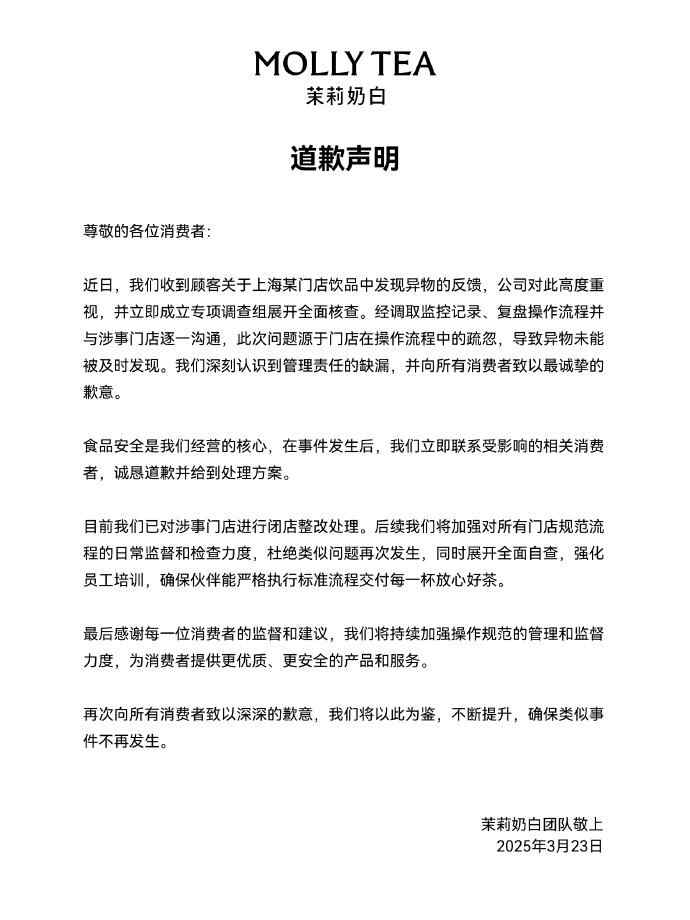 3月23日晚,茉莉奶白官方微博针对此事发布致歉声明。声明显示,近日,公司对此高度重视,并立即成立专项调查组展开全面核查。经调取监控记录、复盘操作流程并与涉事门店逐一沟通,此次问题源于门店在操作流程中的疏忽,导致异物未能被及时发现,“我们深刻认识到管理责任的缺漏,并向所有消费者致以最诚挚的歉意”。