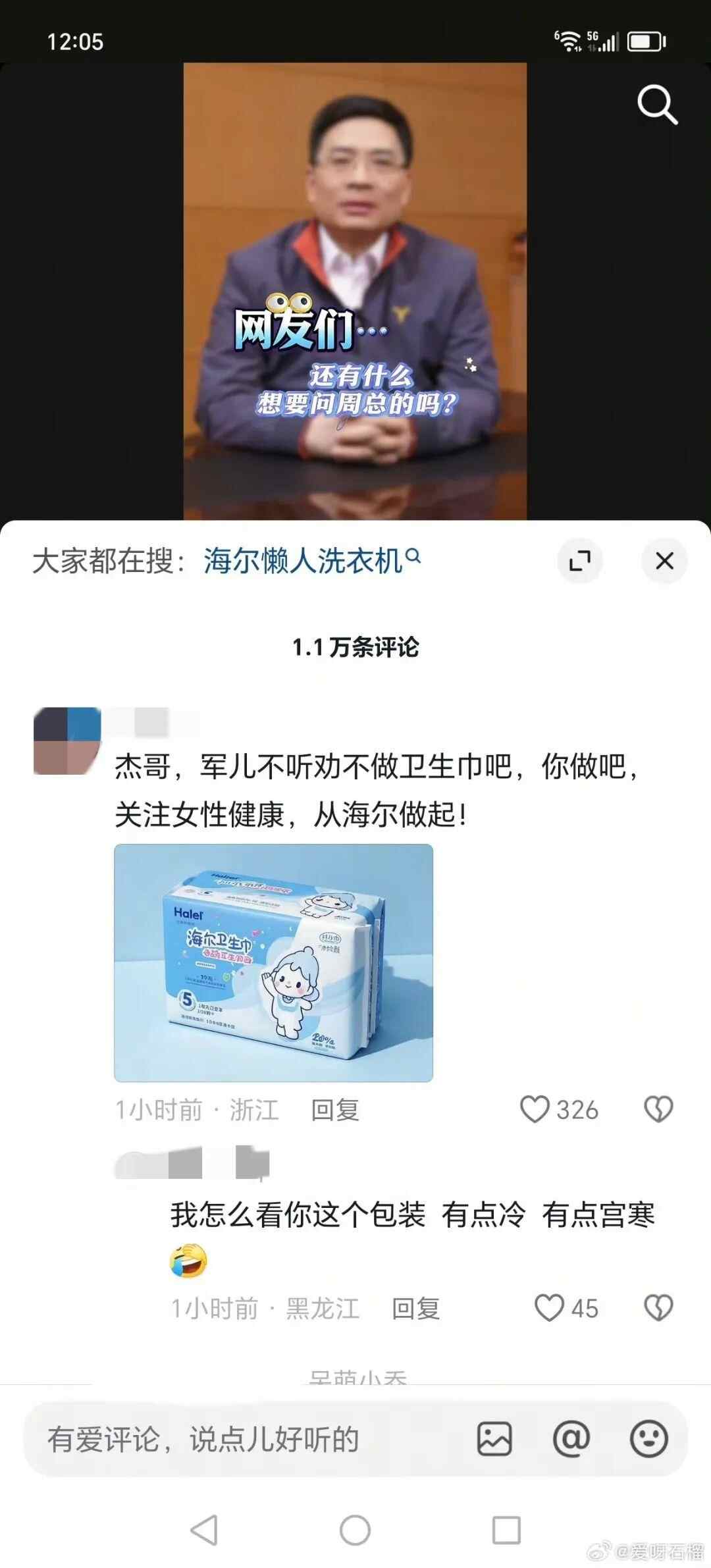 3月21日,海尔总裁周云杰开通社交账号发布视频,有人在评论喊话让海尔做一款卫生巾品牌。