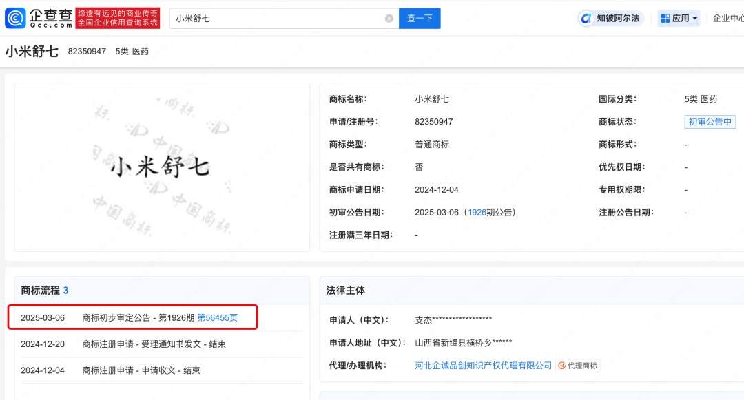 记者查询企查查APP发现,成都一塑料包装公司曾申请一枚“小米卫生巾”商标,目前为驳回待复审状态;自然人支某曾申请一枚“小米舒七”商标,该商标于今年3月6日发布初审公告;阜阳一传媒公司曾申请“小米 SU 吸”商标,国际分类为广告销售,状态为注册申请中。此外,还有多家公司申请“雷巾”等商标,状态均为注册申请中。
