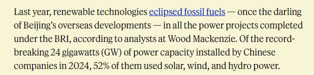报道观察到,中国在全球的基础设施建设正受到绿色技术的推动,共建“一带一路”倡议下的基础设施建设也是如此。