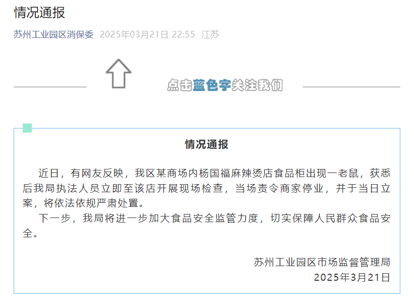 苏州工业园区市场监督管理局3月21日通报,近日,有网友反映,某商场内杨国福麻辣烫店食品柜出现一老鼠,获悉后该局执法人员立即至该店开展现场检查,当场责令商家停业,并于当日立案,将依法依规严肃处置。下一步,苏州工业园区市监局将进一步加大食品安全监管力度,切实保障人民群众食品安全。