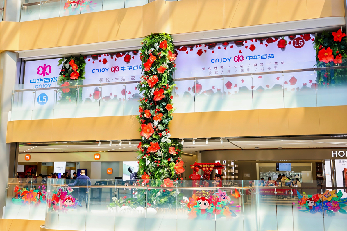 为了打造这场以花为媒的城市对话,中华广场还精心布置了众多木棉花美陈。从中空的锦绣木棉花花柱,到场内随处可见的漫画风格木棉花组景,每一个转角都洋溢着生机与活力,这既是对“英雄城”红色基因深情致敬,也是对传统文化的创新传承。在清明节期间,中华广场还将推出木棉花 DIY 活动,进一步丰富市民的文化体验。