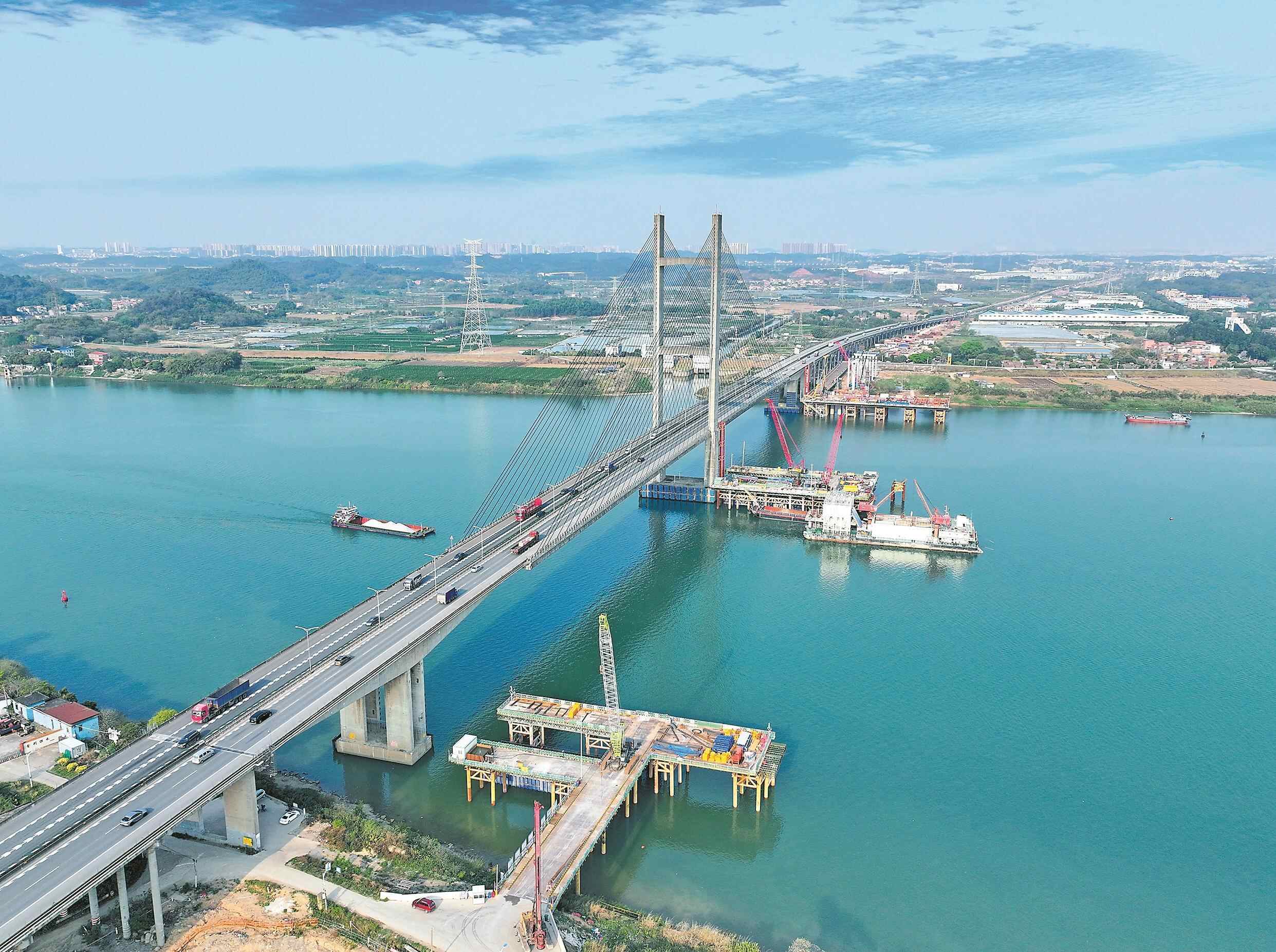 横跨西江、连接佛山市三水区与肇庆市高要区的新建金马大桥全长1936.6米,采用分离增建、独塔双索面组合梁斜拉桥与连续组合梁的协作体系,外部造型和目前正在运营的金马大桥一模一样,相当于在西江上再“复制”一座金马大桥。首个主墩承台“破水而出”后,接下来,项目将集中力量推进新桥主塔封顶。