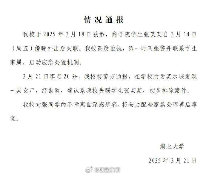 21日上午,湖北大学发布的最新通报显示,学校于3月18日获悉,商学院学生张某某自3月14日(周五)傍晚外出后失联。学校高度重视,第一时间报警并联系学生家属,启动应急处置机制。3月21日零点20分,学校接警方通报,在学校附近某水域发现一具遗体,经勘验,确认系该校失联学生张某某,初步排除案件。学校对张同学的不幸离世深感悲痛,将全力配合家属处理善后事宜。