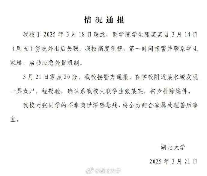 3月21日,湖北大学通报:3月21日零点20分,我校接警方通报,在学校附近某水域发现一具女尸,经勘验,确认系我校失联学生张某某,初步排除案件。
