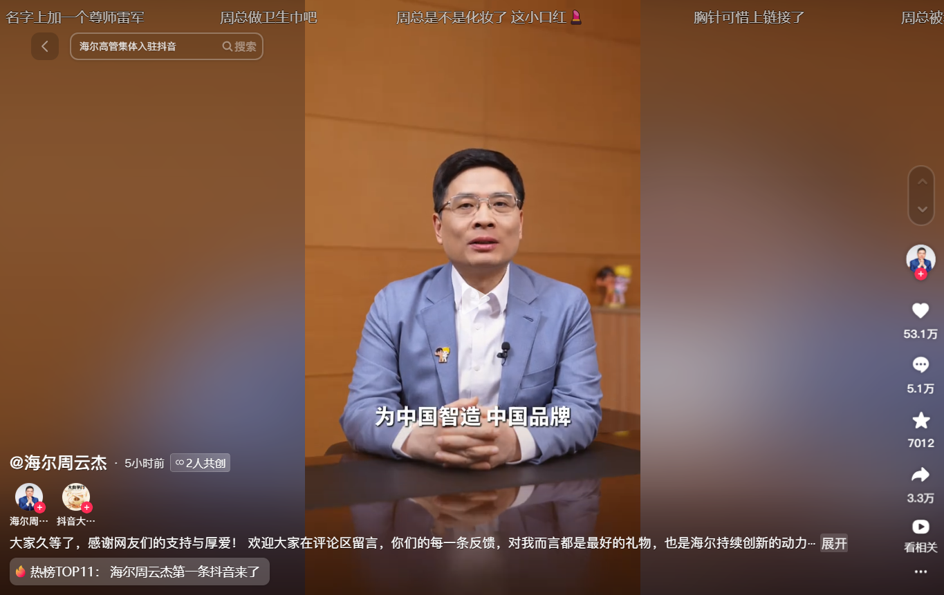 3月21日,海尔CEO周云杰第一条社交平台的视频发布,粉丝已超五十万。