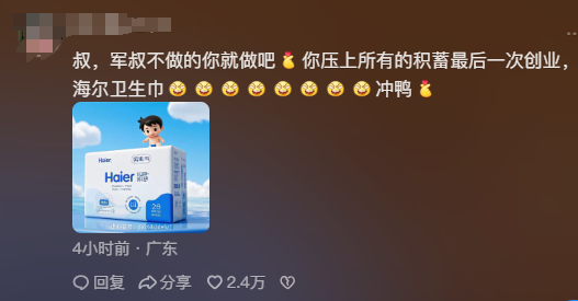 有人建议海尔推出卫生巾,连产品外包装都设计好了,表示“雷军不做的话你来做吧!”还有纸尿裤、安心裤、湿纸巾……