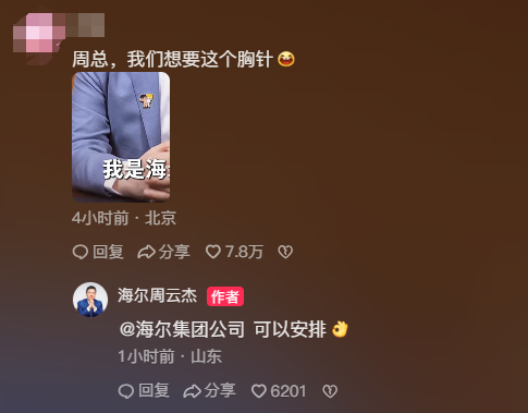 有人许愿想要周云杰出镜时佩戴的胸针,周云杰@海尔集团公司:可以安排!