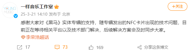 随后,@一样音乐工作室 发文称:“感谢大家对《黑马》实体专辑的支持,随专辑发出的NFC卡片出现的技术问题,目前正在等待相关平台以及技术部门解决,后续解决方案会及时同步大家。”