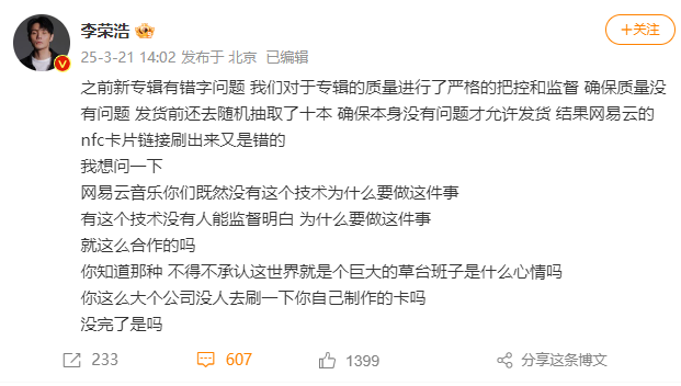 对此,李荣浩发文称:“之前新专辑有错字问题,我们对于专辑的质量进行了严格的把控和监督,确保质量没有问题,发货前还去随机抽取了十本,确保本身没有问题才允许发货,结果网易云的nfc卡片链接刷出来又是错的。”