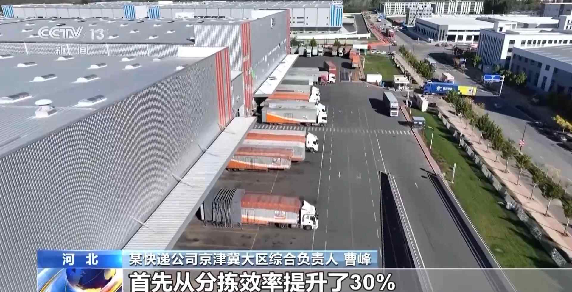 在廊坊固安的这家快递公司华北转运中心,近百个进出港卸货口同时操作,全链路数智化设备同步运转。大量快递包裹在运输带上被快速扫描、分拣,整个过程都在智能管理系统的调配下完成,最快仅需10分钟便可完成装车。