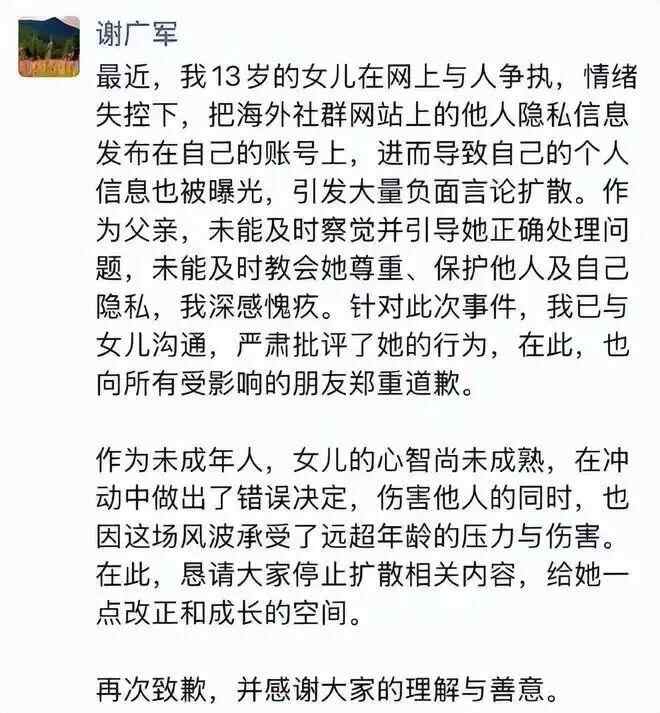 近日,有网友发帖称,有未成年人在网上参与了对一位孕妇的“开盒”,造谣、曝光其工作单位并对其丈夫发去辱骂信息,只因该孕妇发表了对某韩国明星的评论。有网友指认称,参与“开盒”的未成年人为百度副总裁谢广军之女。随后,谢广军发朋友圈表示深感愧疚,“向所有受影响的朋友郑重道歉”。