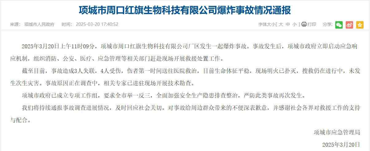 央视网消息:据项城市人民政府网站消息,2025年3月20日上午11时09分,项城市周口红旗生物科技有限公司厂区发生一起爆炸事故。事故发生后,项城市政府立即启动应急响应机制,组织消防、公安、医疗、应急管理等相关部门赶赴现场开展救援处置工作。
