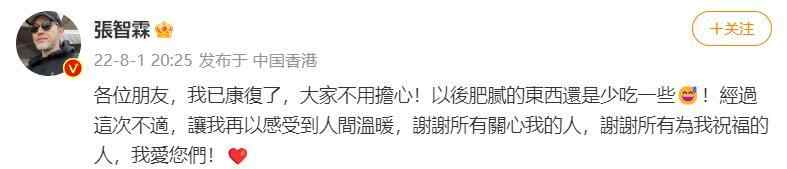 据悉,张智霖曾在2022年确诊得了急性胆囊炎,还因“胆固醇有点高”被妻子袁咏仪下令减肥。