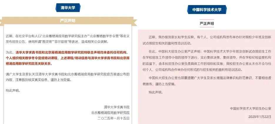 详情:近期,部分社会机构及个人公然以高校名义,发布一系列不实信息,包括收费开展志愿填报指导、举办盈利性培训,甚至宣称能够提供“特殊录取名额”。此类虚假信息不仅误导考生及家长,更严重扰乱了高校招生的正常秩序。对此,清华大学、中国科学技术大学、华东师范大学、兰州大学等多所高校通过官方渠道发表声明,提醒广大考生及家长务必保持高度警惕,增强防范意识,切勿轻信这些虚假宣传,谨防陷入诈骗陷阱,切实维护自身的合法权益。(来源:“微言教育”微信公众号)