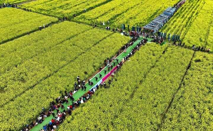 在贵州省榕江县车江大坝,游客在观看民族盛装花田走秀(2025年3月16日摄,无人机照片)。新华社记者 杨文斌 摄